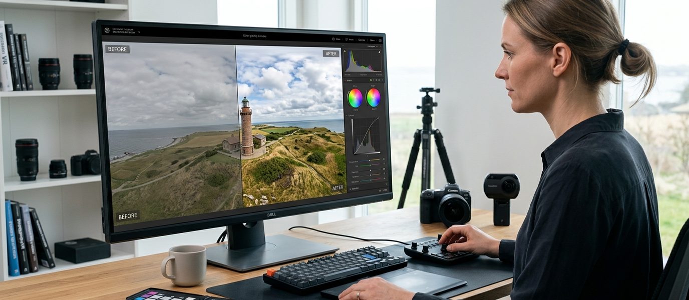 360-graders billeder stiller særlige krav til farvekorrigering. Et almindeligt foto dækker én retning, men et panorama fanger hele scenen rundt om dig. Det betyder, at lysforhold, skyggepartier og farvetemperaturer varierer enormt inden for samme optagelse. Resultatet? Farveskift, unaturlige overgange og billeder der ødelægger den immersive oplevelse.